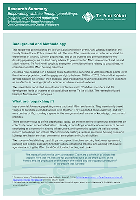 This report summarises the “Empowering Whānau Through Papakāinga: Insights, Impact, and Pathways” research, exploring the experiences of whānau living on papakāinga, and of the trustees and project managers who develop papakāinga.