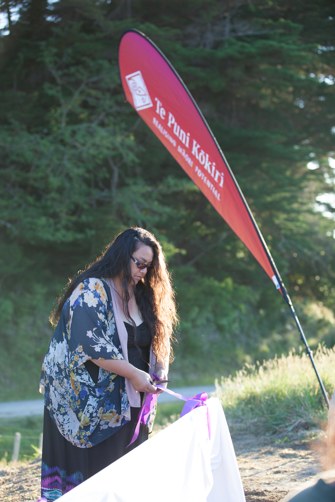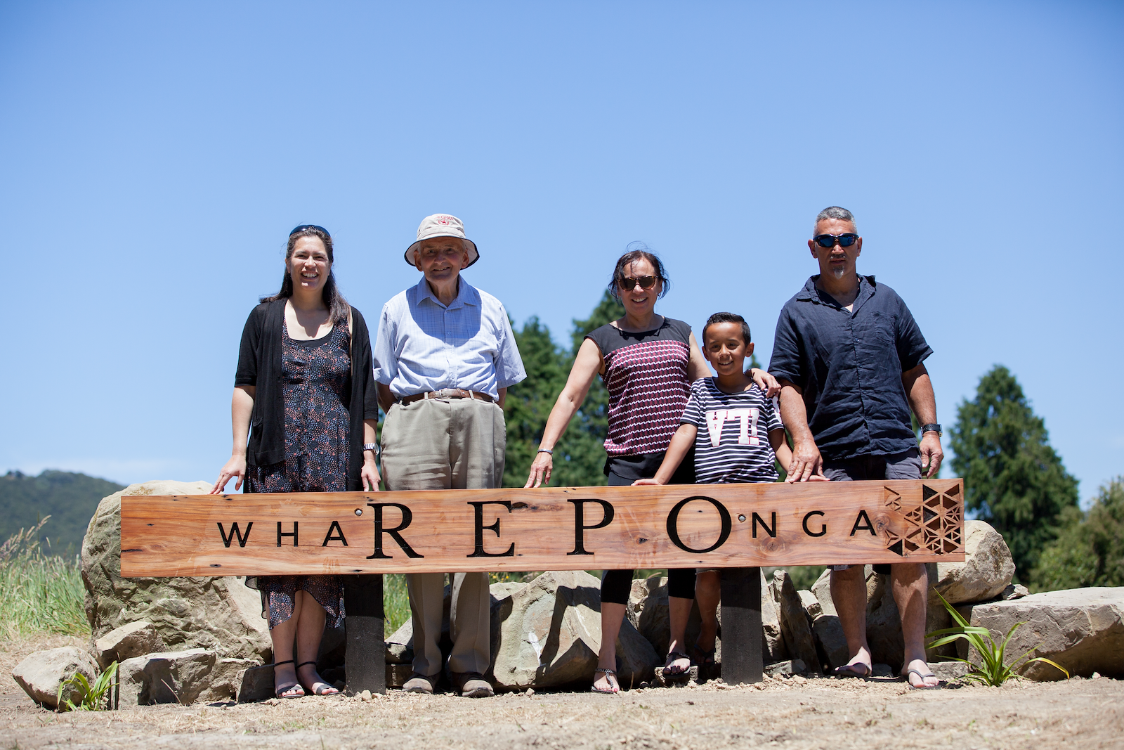 Whānau gathered at signage. Photo by Josie McClutchie.